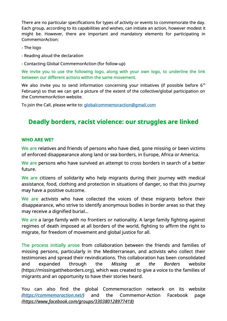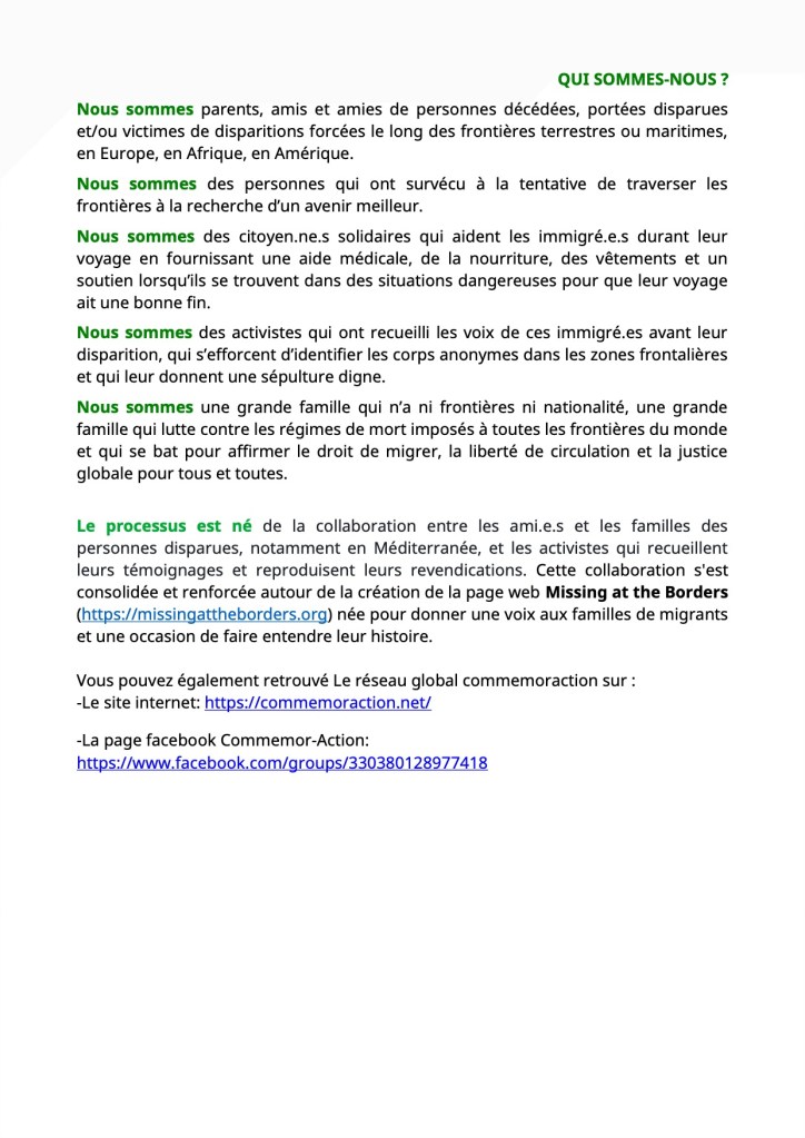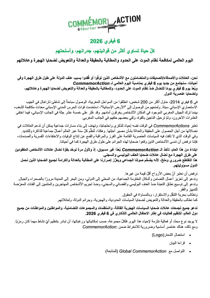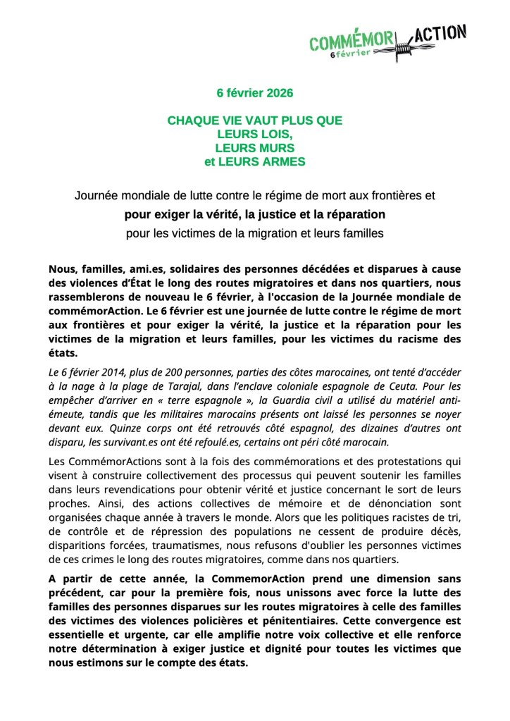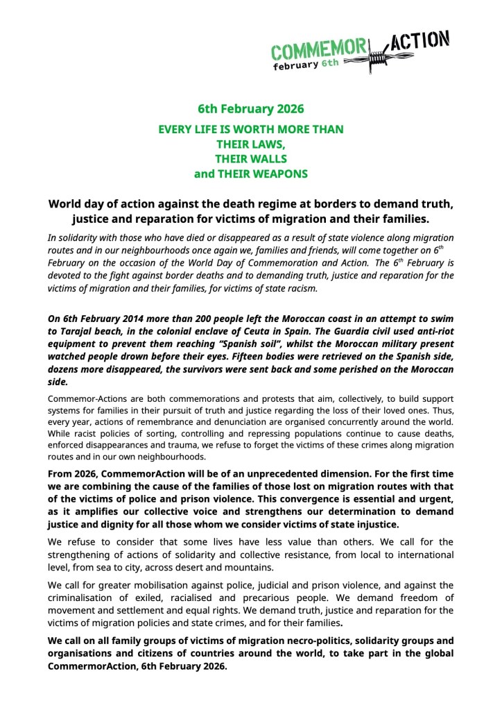 As every year, we invite every city, every community, every person to organize or participate in a CommemorAction on February 6th, 2026 to commemorate those who died or disappeared at the borders.