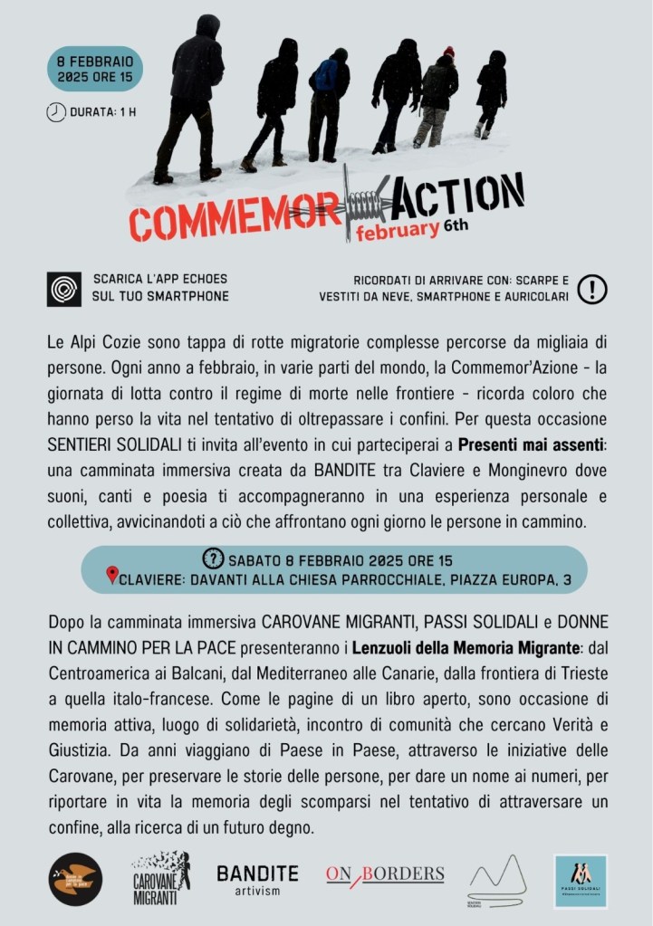 Messina / Italy Milan / Italy / Feb 6th, 18:30h @ Piazza della Scala Oulx / Italy / Feb 8th, 15h Parma / Italy / Feb 6th, 12h @ ArtLab & 18:30h @ Ester’s Corner Rome / Italy / Feb 6th, 18h @ Welcome Center, Piazzale della Stazione Tiburtina Ventimiglia / Italy / Feb 6th, 17h @ Ponte San Ludovico