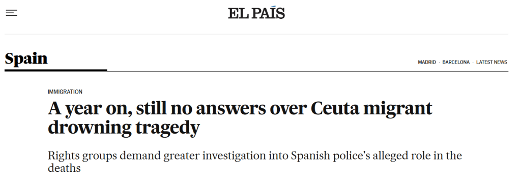 On February 6, 2014 more than 200 people left from the Moroccan coast and tried to reach Tarajal beach, in the Spanish enclave of Ceuta, by swimming. The Guardia Civil deployed anti-riot equipment to stop them from arriving on “Spanish land”, and the Moroccan military present did not help the people who were drowning in front of them. Fifteen bodies were found on the Spanish side, dozens of others disappeared, the survivors were pushed back, and some died on the Moroccan side.